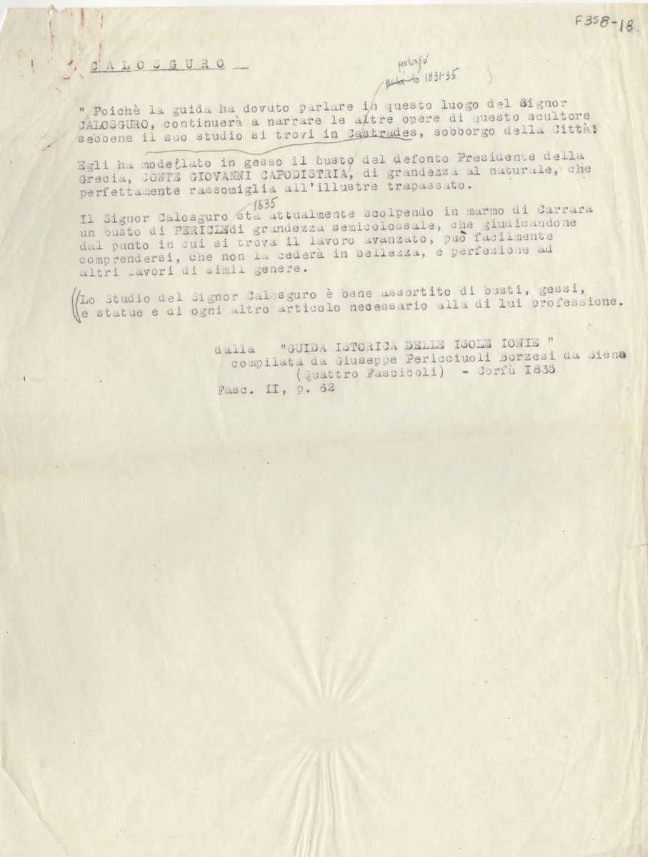 Κείμενο, δακτυλόγραφο, χαρτί, 28×21 εκ., στα ιταλικά, που αναφέρεται στον Ιωάννη Καλοσγούρο.