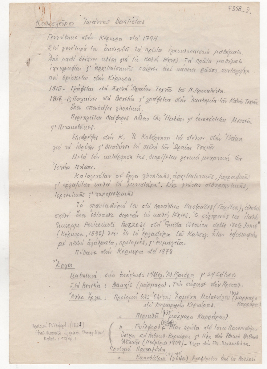 Βιογραφικό, χειρόγραφο, με μολύβι, χαρτί διπλής όψεως, 20,5×19,5 εκ., στα ελληνικά, του Ιωάννη Βαπτιστή Καλοσγούρου. Περιέχει προσωπικά στοιχεία, σπουδές και έργα.