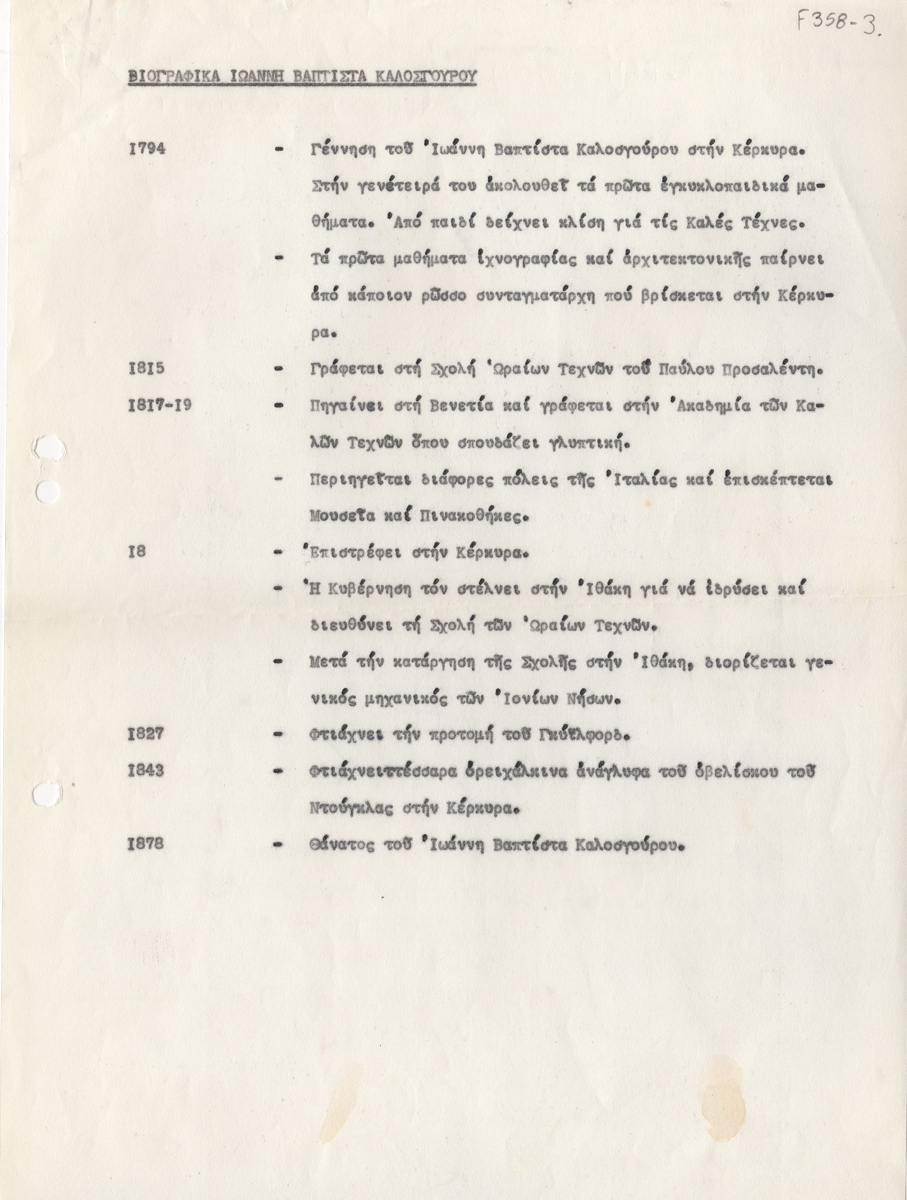 Βιογραφικό, δακτυλόγραφο, χαρτί, 29,5×21 εκ., στα ελληνικά, του Ιωάννη Βαπτίστα Καλοσγούρου. Περιέχει χρονολογική λίστα με τα σημαντικότερα γεγονότα.