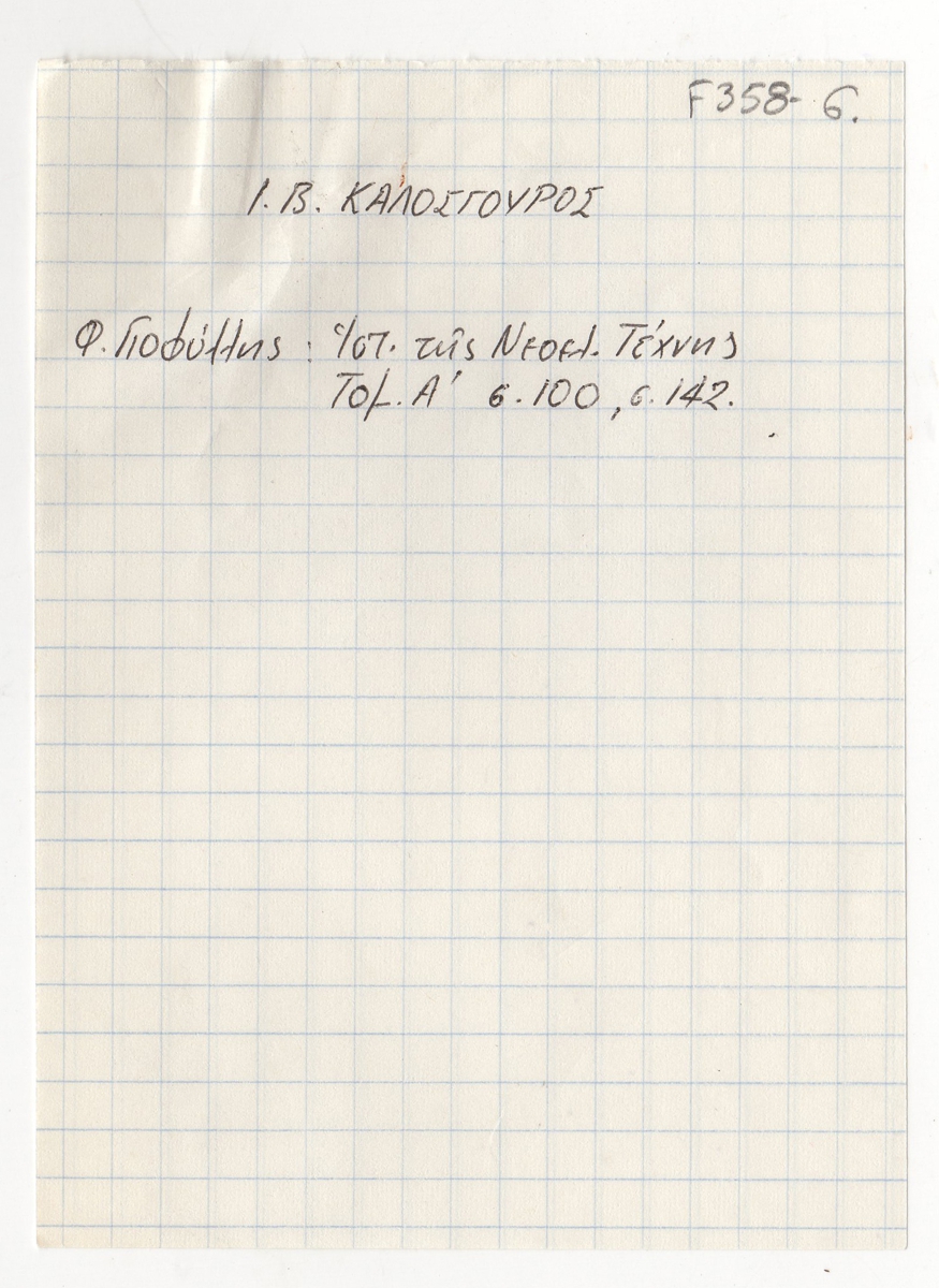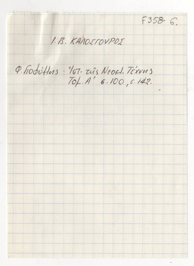 Απόκομμα, χαρτί, 12,5×9 εκ., στα ελληνικά, με χειρόγραφη βιβλιογραφική παραπομπή για τον Ιωάννη Βαπτιστή Καλοσγούρο.