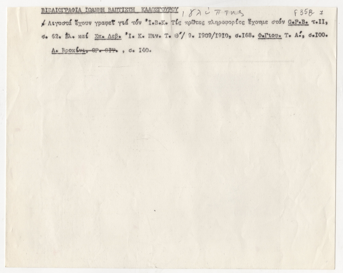 Απόκομμα δακτυλόγραφου, χαρτί, 17×21 εκ., στα ελληνικά, με βιβλιογραφικές αναφορές για τον Ιωάννη Βαπτιστή Καλοσγούρο.