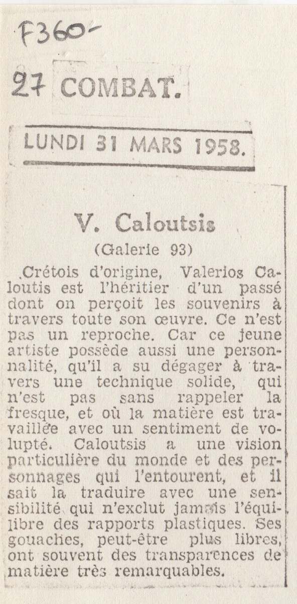 Φωτοαντίγραφο, χαρτί, 26,5×21 εκ., στα γαλλικά, δημοσίευσης κριτικής έκθεσης του Βαλέριου Καλούτση, η οποία διεξάγεται στην Galerie 93 στο Παρίσι.