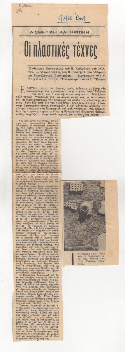 Απόκομμα, χαρτί ακανόνιστου μεγέθους, στα ελληνικά, δημοσίευσης κριτικής έκθεσης του Βαλέριου Καλούτση, η οποία διεξάγεται στην Αίθουσα Τέχνης Αθηνών Χίλτον.