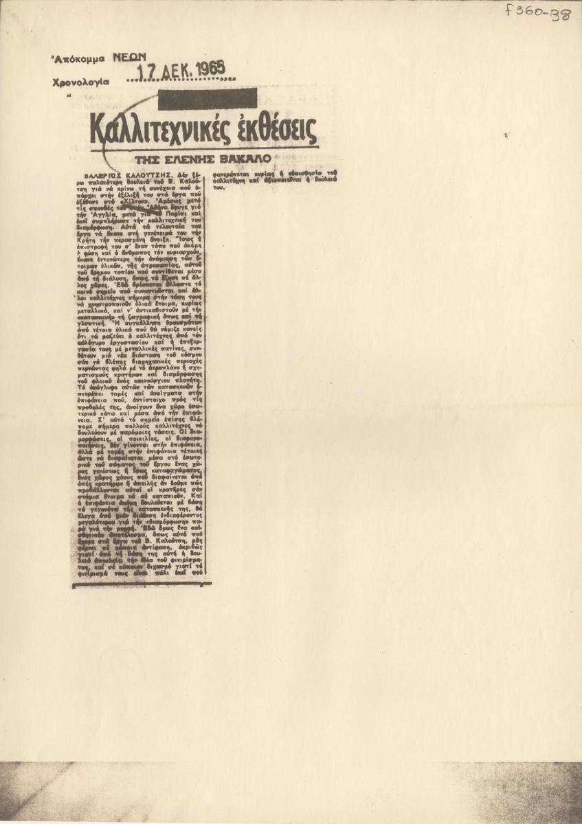 Φωτοαντίγραφο, χαρτί, 29,5×21 εκ., στα ελληνικά, δημοσίευσης κριτικής έκθεσης του Βαλέριου Καλούτση.
