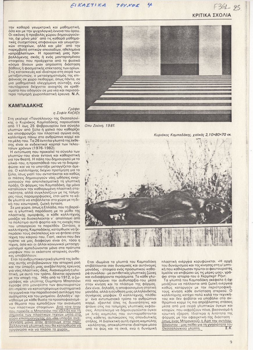 Φωτοαντίγραφο, χαρτί, 29,5×21 εκ., στα ελληνικά, δημοσίευσης κριτικής έκθεσης του Κυριάκου Καμπαδάκη, η οποία διεξάγεται στην Γκαλερί Πανσέληνος στη Θεσσαλονική. Εικονογραφείται και φέρει επιγραφές.