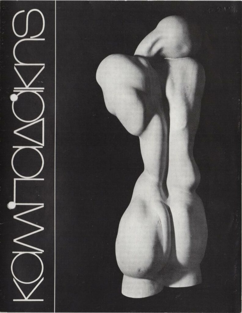 Έντυπο, χαρτί ιλλουστρασιόν τρίπτυχο, στα ελληνικά, ατομικής έκθεσης του Κυριάκου Καμπαδάκη. Εικονογραφείται και περιέχει βιογραφικό σημείωμα, κείμενο του Χρύσανθου Χρήστου με τίτλο “Η ανθρώπινη μορφή σαν εκφραστική δυνατότητα. Η γλυπτική του Κυριάκου Καμπαδάκη” και κριτική του Στέλιου Λυδάκη.