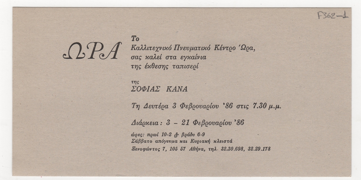 Πρόσκληση, χαρτόνι, 10×19,5 εκ., στα ελληνικά, ατομικής έκθεσης ζωγραφικής της Σοφίας Κανά.