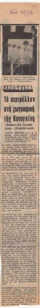 Απόκομμα, χαρτί, 40×5 εκ., δημοσίευσης κριτικής έκθεσης της Νίκης Καναγκίνη, η οποία διεξάγεται στην Γκαλερί Ζουμπουλάκη, στην Αθήνα.