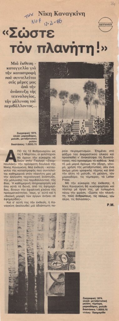 Απόκομμα, χαρτί, 32,5×12 εκ., στα ελληνικά, δημοσίευσης κριτικής έκθεσης της Νίκης Καναγκίνη, η οποία διεξάγεται στην Γκαλερί Ιόλα Ζουμπουλάκη, στην Αθήνα.
