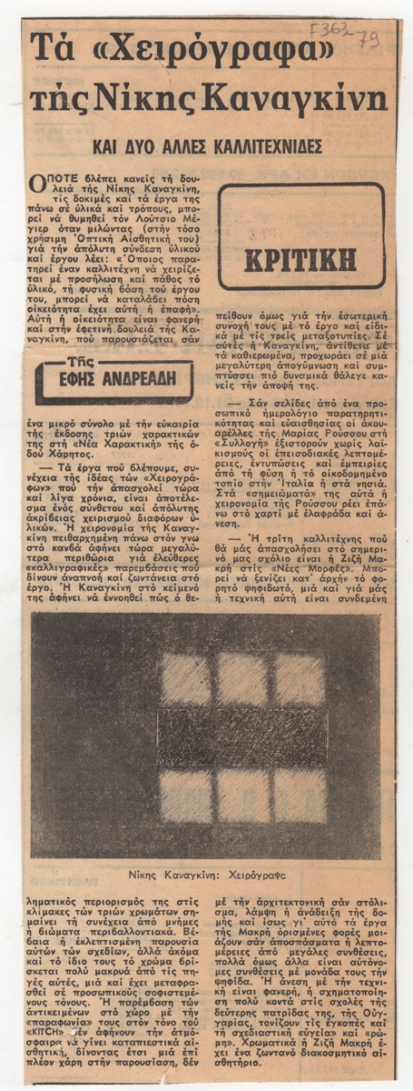 Απόκομμα, χαρτί, 28,5×10 εκ., στα ελληνικά, δημοσίευσης κριτικής εκθέσεων των Νίκη Καναγκίνη, Ζιζή Μακρή και Μαρία Ρούσσου. Εντάσσεται στην ομώνυμη στήλη του εντύπου. Το απόκομμα εικονογραφείται.