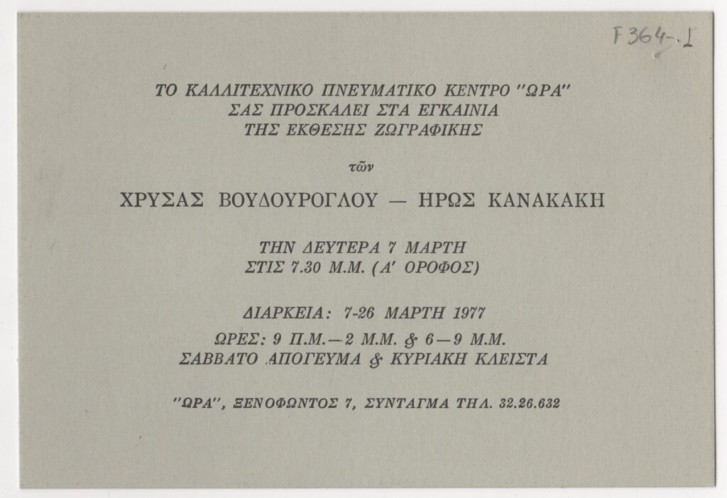 Πρόσκληση, χαρτόνι, 11×16 εκ., στα ελληνικά, εγκαινίων ομαδικής έκθεσης των Χρύσα Βουδουρογλου και Ηρώς Κανακάκη, η οποία διεξάγεται στο Καλλιτεχνικό Πνευματικό Κέντρο Ώρα, στην Αθήνα.