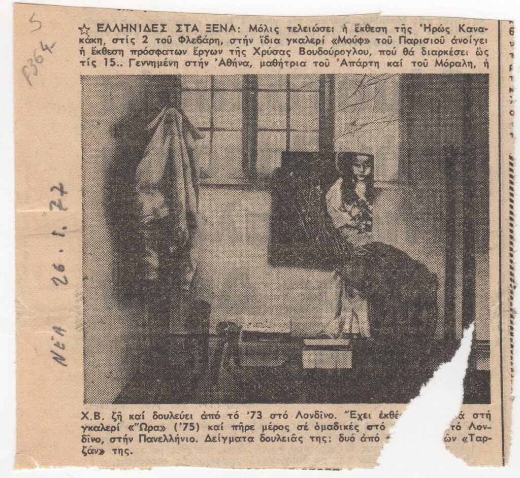 Απόκομμα, χαρτί, 2 φφ, 9,5×11,5 εκ., στα ελληνικά, δημοσιεύσεων αναγγελιών ατομικών εκθέσεων των Ηρώς Κανακάκη και Χρύσας Βουδούρογλου, στην γκαλερί Mouffe, στο Παρίσι.
