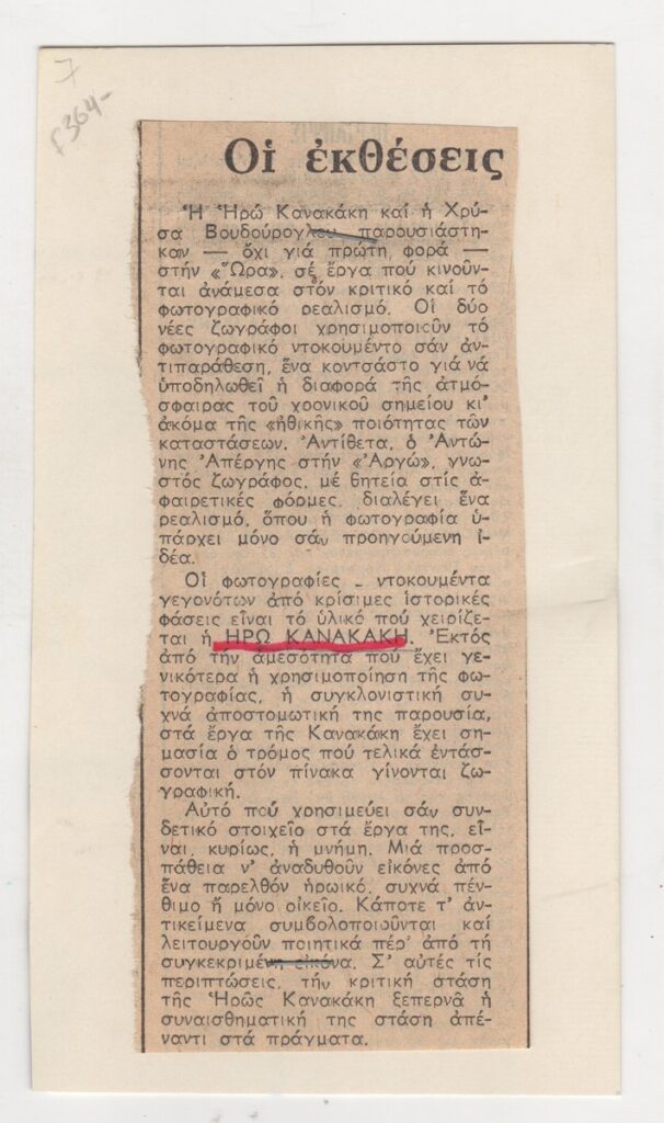 Απόκομμα, χαρτί συρραμένο σε έντυπο, 14,5×8 εκ., στα ελληνικά, δημοσίευσης κριτικής έκθεσης των Ηρώς Κανακάκη και Χρύσας Βουδούρογλου, η οποία διεξάγεται στο Καλλιτεχνικό Πνευματικό Κέντρο Ώρα.