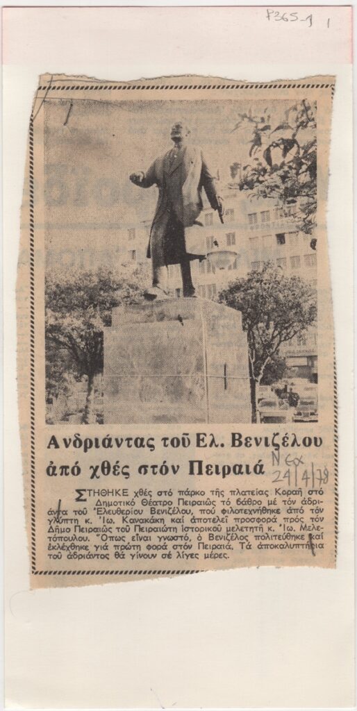 Απόκομμα, χαρτί συρραμένο σε έντυπο 21×10,5 εκ., στα ελληνικά, δημοσίευσης άρθρου αναφερόμενου σε άγαλμα του Ελευθερίου Βενιζέλου το οποίο στήθηκε στην πλατεία Κοραή, στον Πειραιά και φιλοτεχνήθηκε από τον Ιωάννη Κανακάκη.