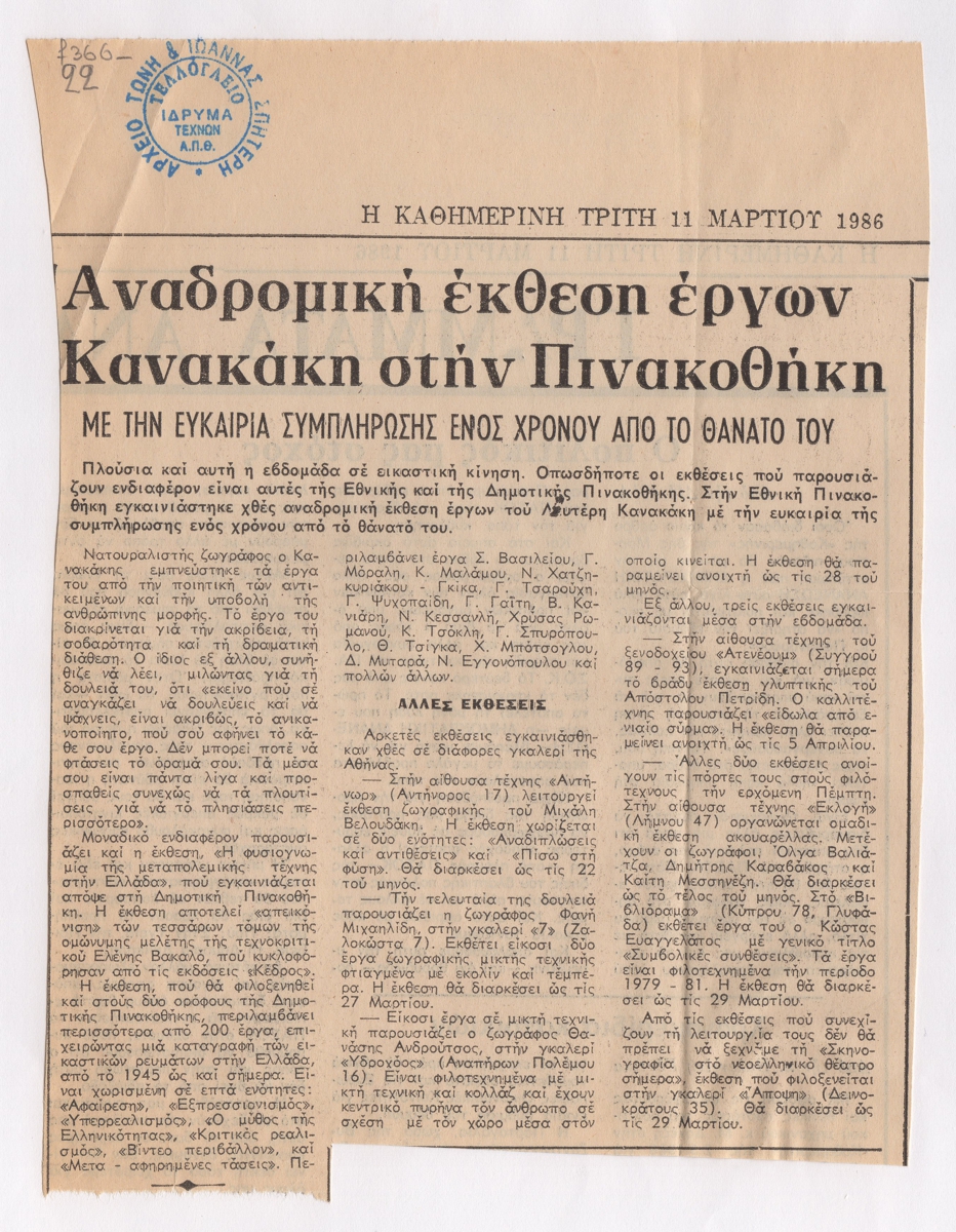 Απόκομμα εντύπου, χαρτί κολλημένο σε κόλλα, 20×16 εκ., στα ελληνικά, με κείμενο που αναφέρεται στην αναδρομική έκθεση έργων του Λευτέρη Κανακάκι. Στο ίδιο γίνεται αναφορά σε τρέχουσες εκθέσεις της περιόδου.