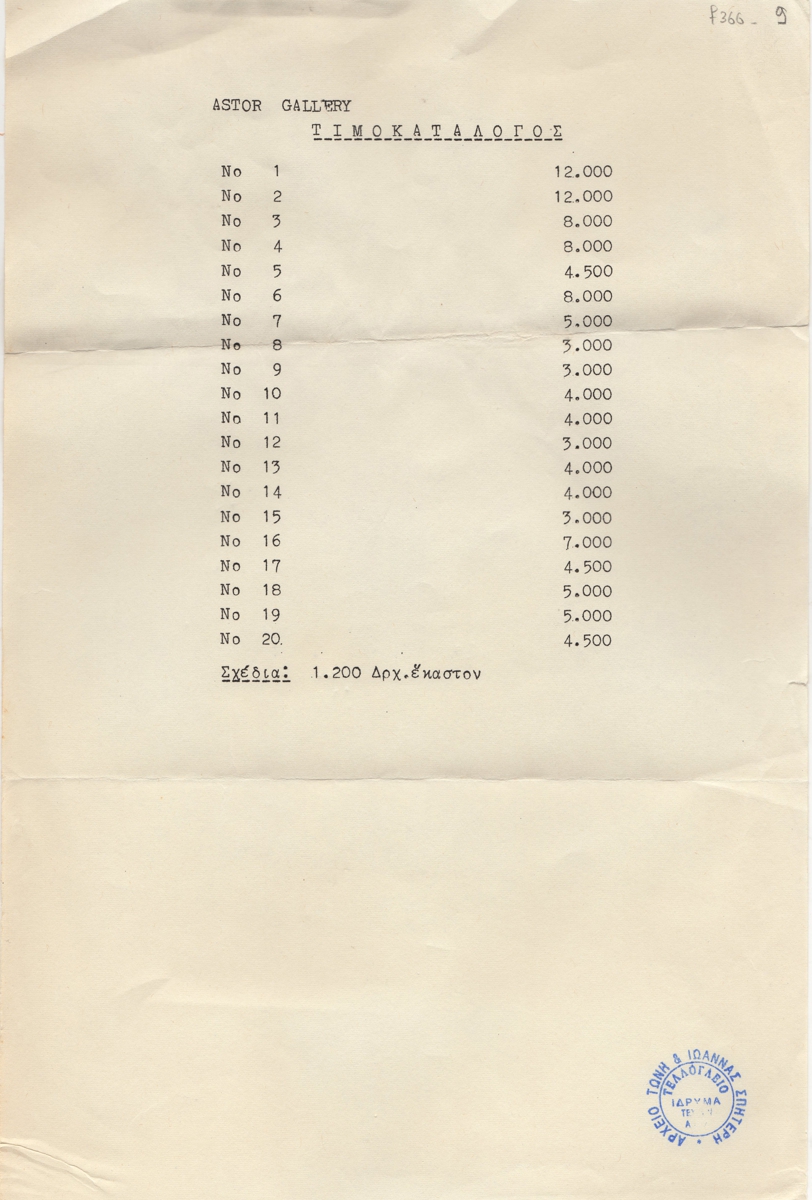 Τιμοκατάλογος, χαρτί, 31,5×21 εκ., στα ελληνικά, έργων, ατομικής έκθεσης του Λευτέρη Κανακάκι, στην γκαλερί Άστορ στην Αθήνα.