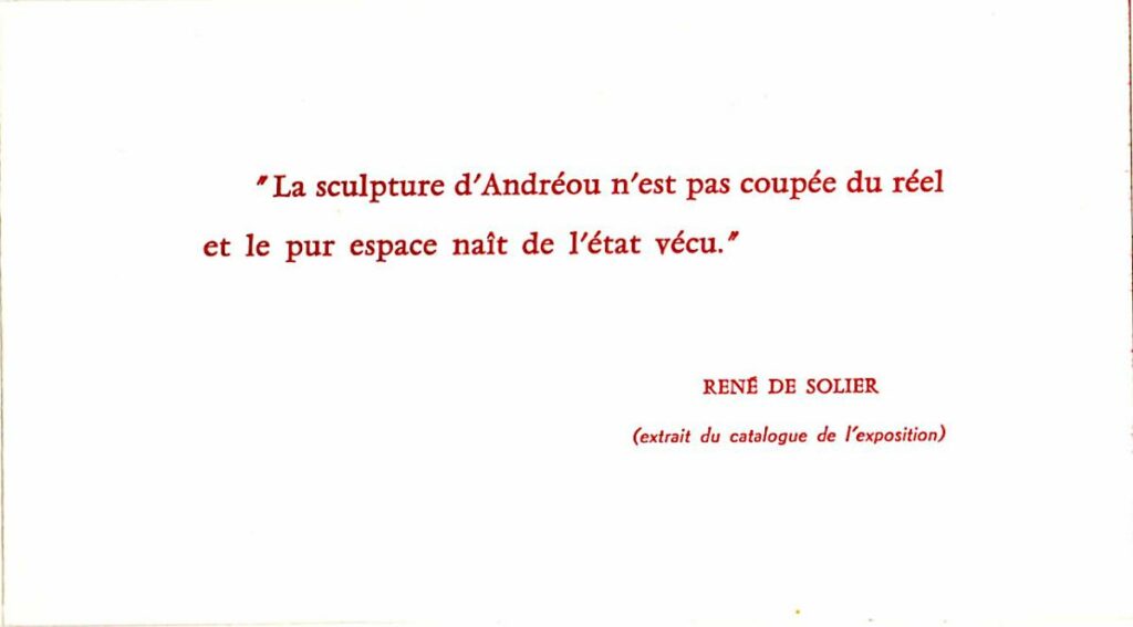 Πρόσκληση έκθεσης του Κώστα Ανδρέου, η οποία διεξάγεται στην Galerie Pierre Domec, στο Παρίσι. Περιέχει απόσπασμα κειμένου του René de Solier.