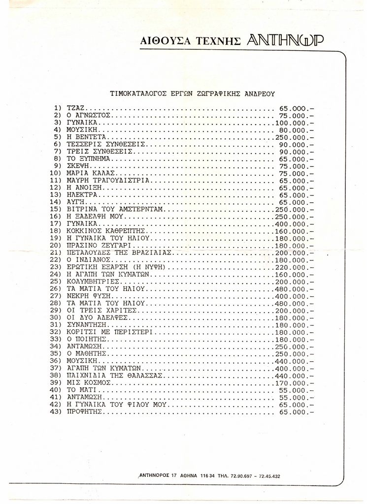 Τιμοκατάλογος έργων, χαρτί, 30×21εκ, στα ελληνικά, έκθεσης του Κώστα Ανδρέου.