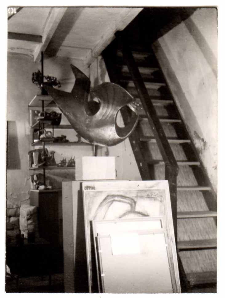 Φωτογραφία, α/μ, φωτογραφικό χαρτί, 6×4,5εκ, με απεικονιζόμενο έργο του Κώστα Ανδρέου στο εργαστήρι του στο Παρίσι.