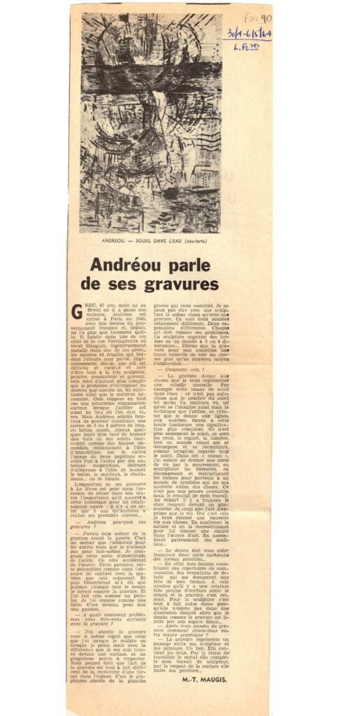 Απόκομμα, χαρτί, 42×12 εκ., στα γαλλικά, δημοσίευσης συνέντευξης του Κώστα Ανδρέου.