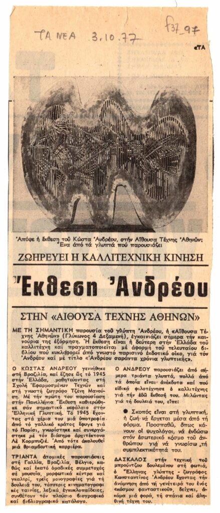Απόκομμα της εφημερίδας “Τα Νέα” (10/1977) κριτικής έκθεσης του Κώστα Ανδρέου,η οποία διεξάγεται στην Αίθουσα Τέχνης Αθηνών.