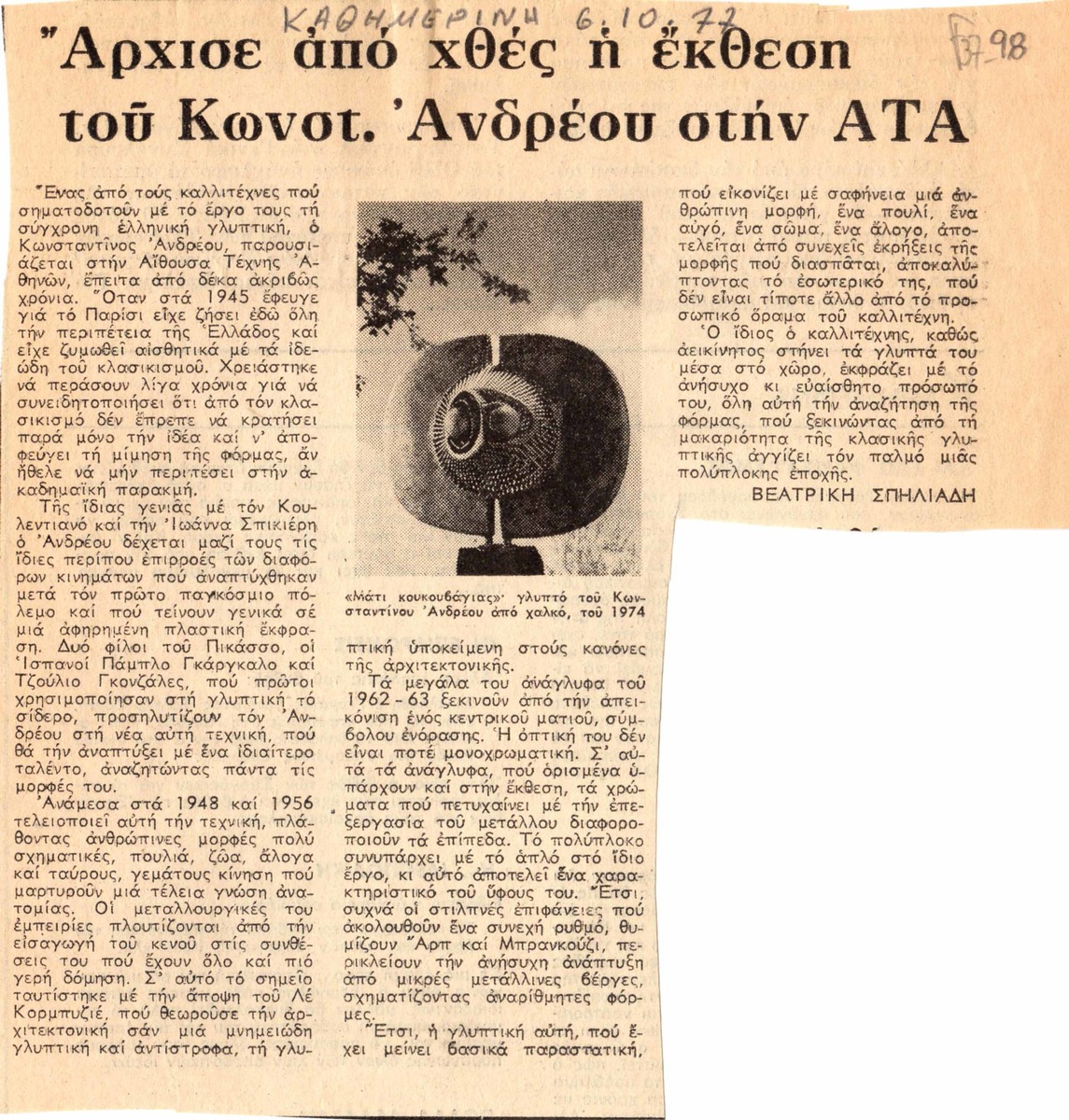Απόκομμα της εφημερίδας “Η Καθημερινή” (06/10/1977) δημοσίευσης κριτικής έκθεσης του Κώστα Ανδρέου, η οποία διεξάγεται στην Αίθουσα Τέχνης Αθηνών.