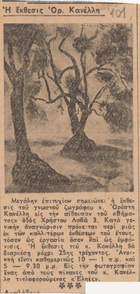 Απόκομμα, χαρτί, 10×5 εκ., στα ελληνικά, δημοσίευσης κριτικής έκθεσης του Ορέστη Κανέλλη, η οποία διεξάγεται στην Αίθουσα Το Βήμα, στην Αθήνα.