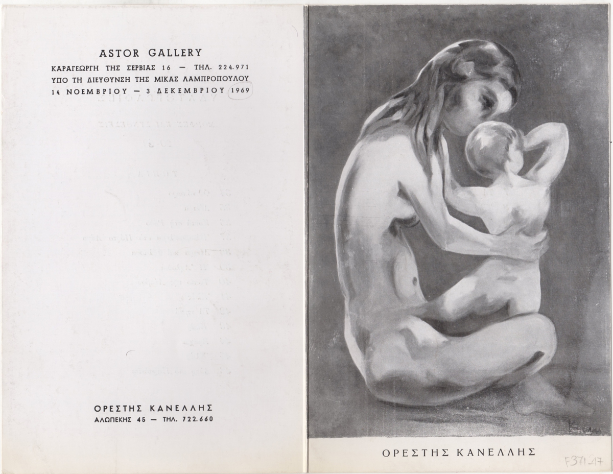 Κατάλογος και ένθετος τιμοκατάλογος, χαρτόνι αναδιπλωμένο και χαρτί, 21,5×14 εκ., στα ελληνικά, έργων ατομικής έκθεσης του Ορέστη Κανέλλη, η οποία διεξάγεται στην Astor Gallery.