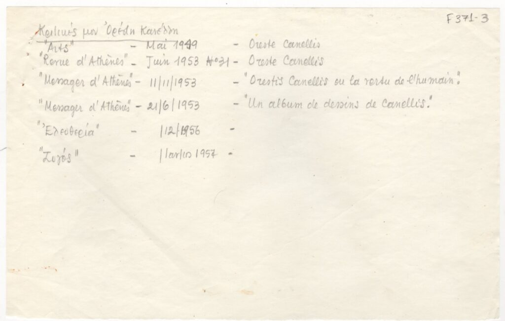 Λίστα, χειρόγραφη με μολύβι, χαρτί, 13,5×21,5 εκ., στα ελληνικά, κριτικών για τον Ορέστη Κανέλλη στον ελληνικό και γαλλικό Τύπο κατά την περίοδο 1949-1957.