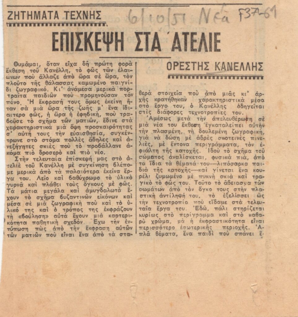 Απόκομμα, χαρτί, 38×11 εκ., στα ελληνικά, δημοσίευσης άρθρου της Ελένης Βακαλό, μετά από επίσκεψή της στο ατελιέ του Ορέστη Κανέλλη. Αναφέρεται στα έργα του καλλιτέχνη.