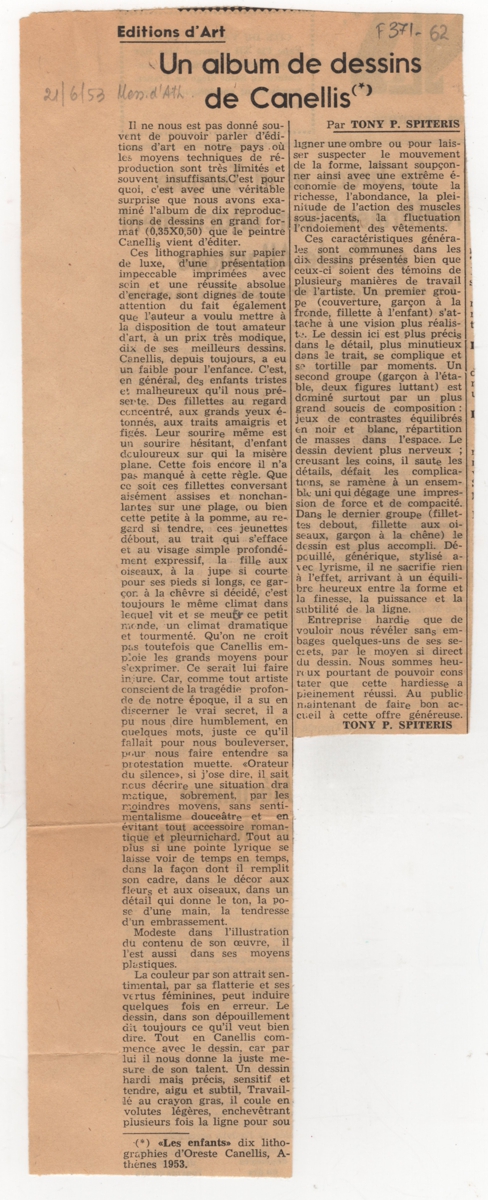 Απόκομμα, χαρτί 33×13 εκ., στα γαλλικά, δημοσίευσης άρθρου τουΤώνη Σπητέρη αναφερόμενου σε λιθογραφίες του Ορέστη Κανέλλη που εξέδωσε σε λεύκωμά του.