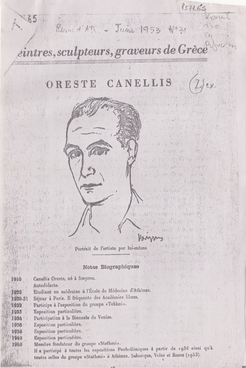 Φωτοαντίγραφο, χαρτί, 5 φφ, 23×15 εκ., στα γαλλικά, δημοσίευσης κειμένου για τον Ορέστη Κανέλλη και το έργο του. Περιέχει βιογραφικές πληροφορίες για τον καλλιτέχνη και εντάσσεται στην ενότητα “Peintres, sculpteurs, graveurs de Grèce”.