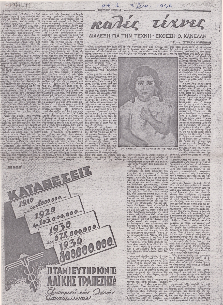 Φωτοαντίγραφο, χαρτί, 2 φφ, 29,5×21 εκ., στα ελληνικά, δημοσίευσης διάλεξης του Στράτη Μυριβήλη για τον Ορέστη Κανέλλη, με αφορμή ατομική έκθεση του καλλιτέχνη στην γκαλερί Ζυγός, στην Αθήνα.