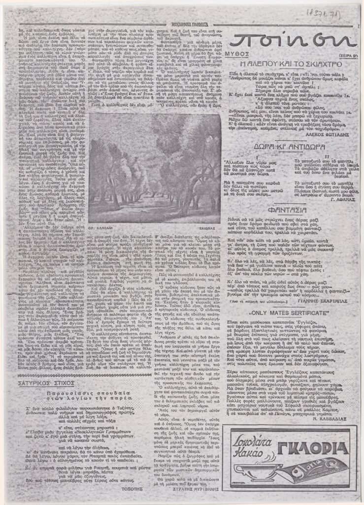 Στο ίδιο, ποιήματα των Αλέκου Φωτιάδη, Γ. Αθανασ., Γιάννη Σκαρίμπα, Ν. Καββαδία. Επίσης, διαφήμιση “Το ταμιευτήριο της Λαϊκής Τραπέζης” και “Σοκολάτα Γκλόρια”.