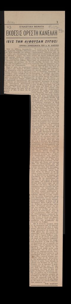 Απόκομμα, χαρτί, 47.5×10 εκ., στα ελληνικά, δημοσίευσης κριτικής έκθεσης του Ορέστη Κανέλλη, η οποία διεξάγεται στην Γκαλερί Ζυγός στην Αθήνα.