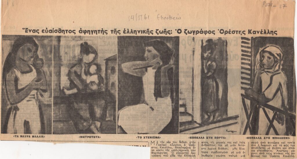 Απόκομμα, χαρτί, 15,5×28,5 εκ., στα ελληνικά, δημοσίευσης αναπαραγωγών έργων του Ορέστη Κανέλλη, που εξέθεσε στην ατομική του έκθεση στην γκαλερί Ζυγός, στην Αθήνα.