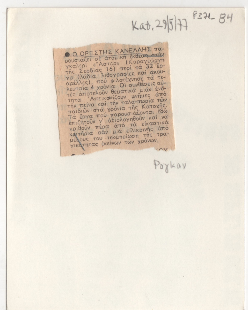 Απόκομμα, χαρτί συρραμμένο σε έντυπο συνολικών διαστάσεων, 14×11 εκ., στα ελληνικά, δημοσίευσης κριτικής έκθεσης του Ορέστη Κανέλλη με έργα του που αναφέρονται θεματικά στα χρόνια της Κατοχής.
