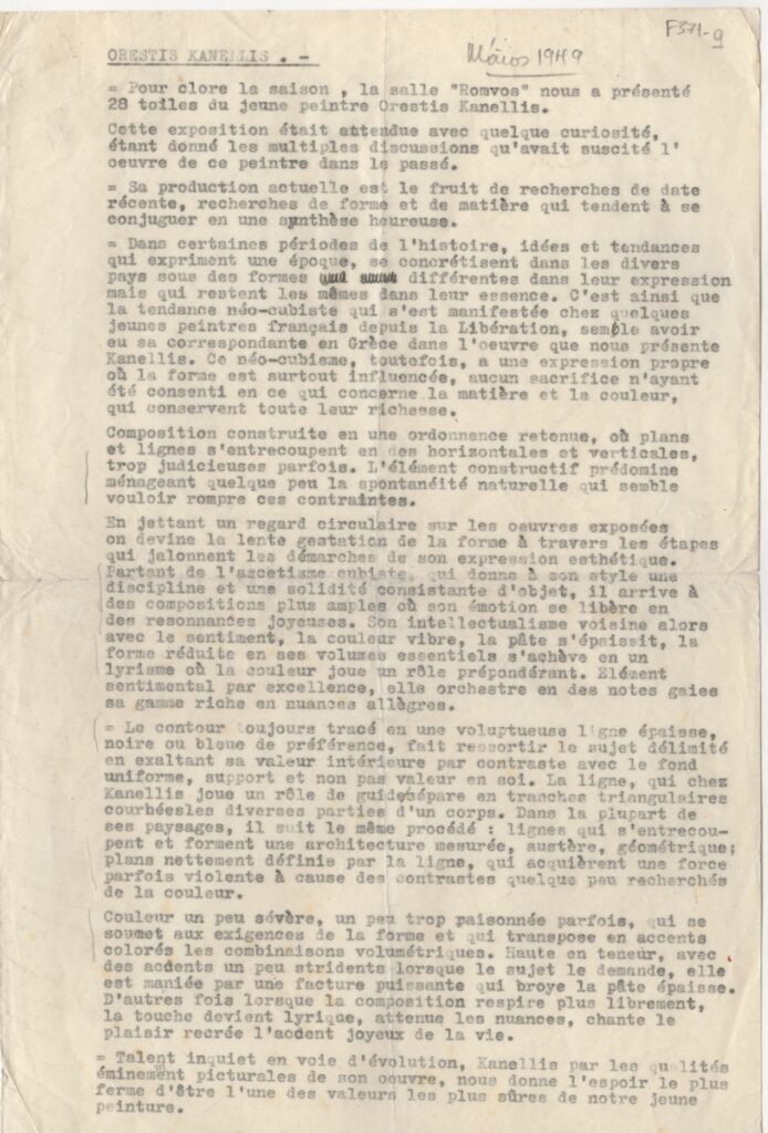 Κείμενο, δακτυλόγραφο, χαρτί, 29.5×19.5 εκ., στα γαλλικά, που αποτελεί προσχέδιο κριτικής του Τώνη Σπητέρη, για έργο του Ορέστη Κανέλλη, το οποίο παρουσιάζει σε ατομική του έκθεση στην Γκαλερί Ρόμβος.