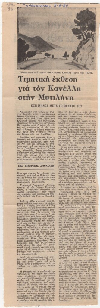 Απόκομμα, χαρτί, 37×11,5 εκ., στα ελληνικά, δημοσίευσης άρθρουαναφορικά με τιμητική αναδρομική έκθεση που διοργανώθηκε για τον Ορέστη Κανέλλη και εγκαινιάστηκε στο Δημοτικό θέατρο Μυτιλήνης σε συνεργασία με την γκαλερί Άστορ.