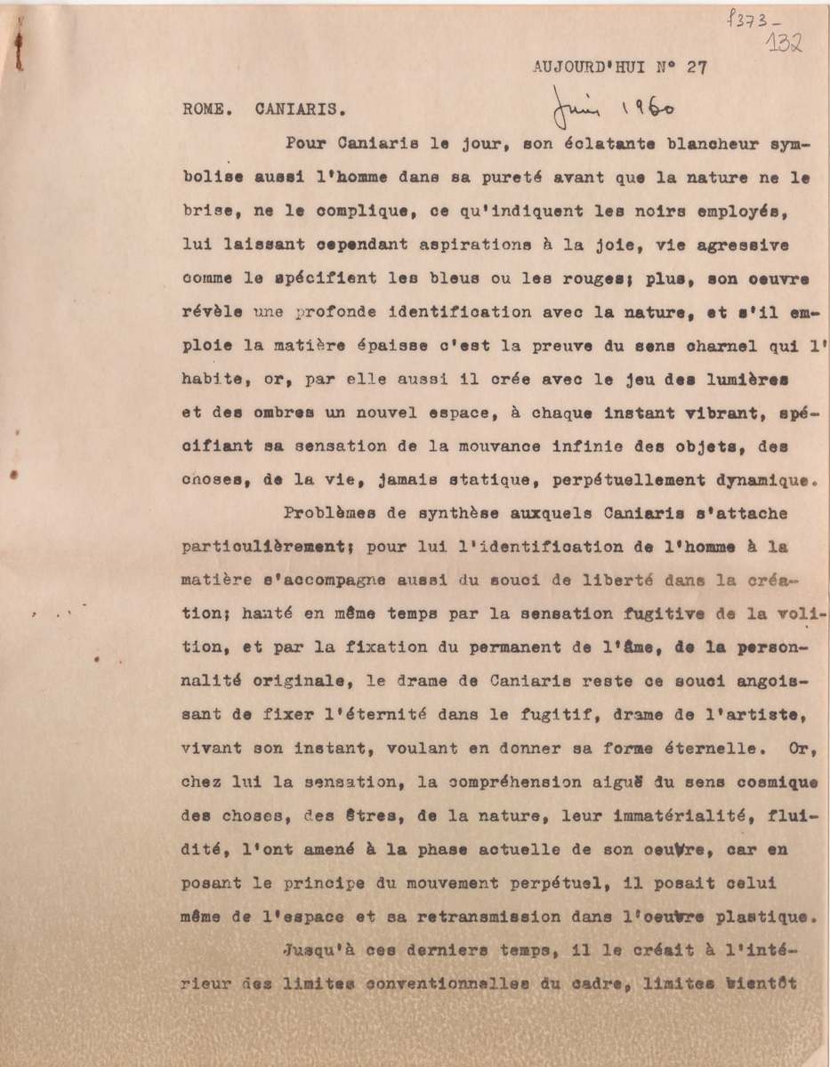 Κριτική, δακτυλόγραφο, 2 φφ, 27×21 εκ., στα γαλλικά, για το έργο που παρουσιάζει ο Βλάσης Κανιάρης σε ατομική του έκθεση στην Galeria La Tartaruga, στη Ρώμη.