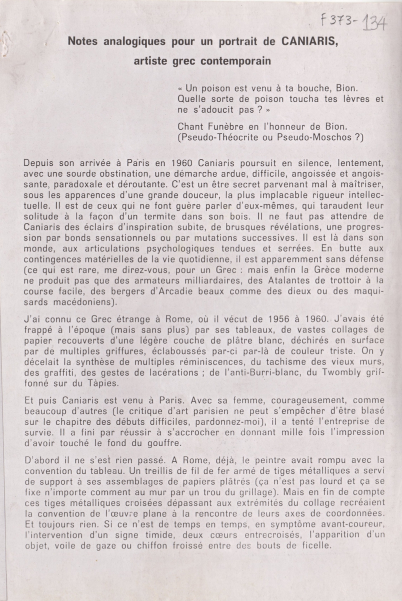 Φωτοαντίγραφο, χαρτί, 3 φφ, 21×15 εκ., στα γαλλικά, δημοσίευσης κειμένου για τη ζωή και το έργο του Βλάση Κανιάρη. Γίνεται ιδιαίτερος λόγος για τα ‘Περιβάλλοντα’ του καλλιτέχνη.