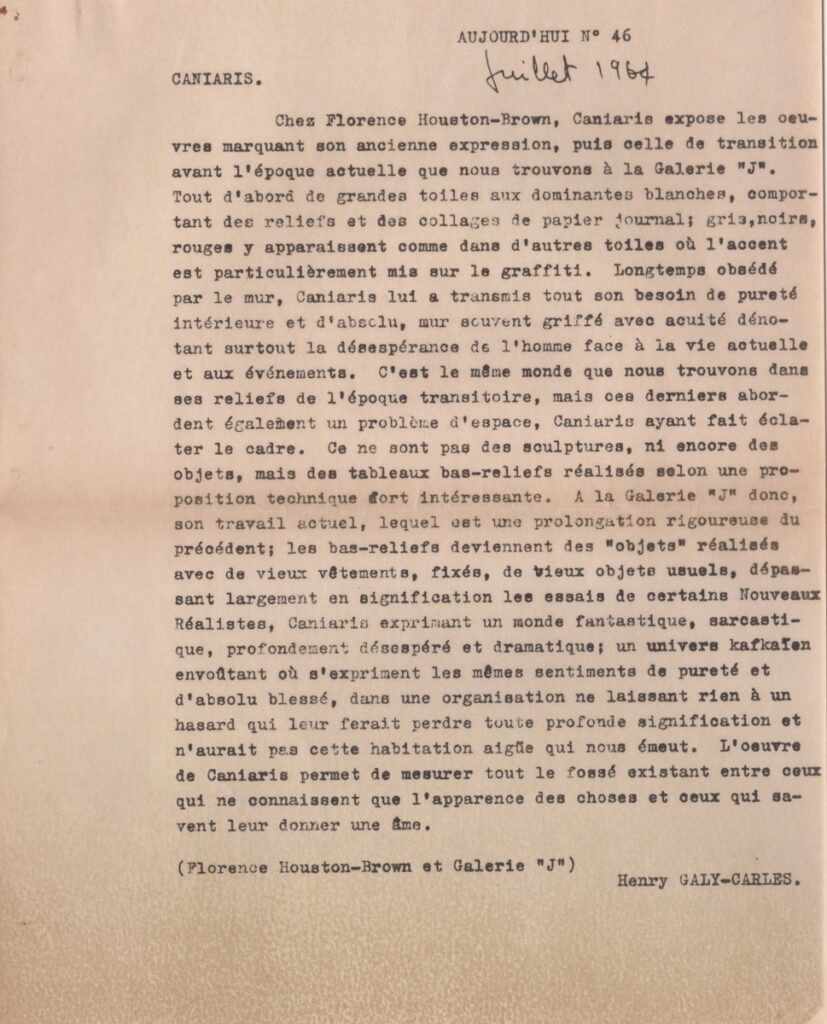 Αποδελτίωση, χαρτί, 27×21 εκ., στα γαλλικά, δημοσίευσης κριτικής έκθεσης του Βλάση Κανιάρη, η οποία διεξάγεται στην γκαλερί Florence Houston Brown.