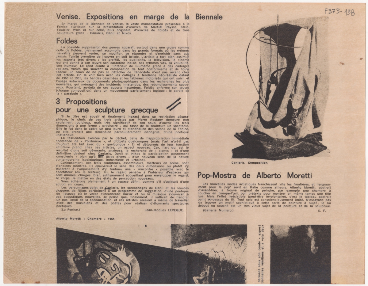 Φωτοαντίγραφο, χαρτί, 21×27 εκ., στα γαλλικά, δημοσίευσης κριτικής έκθεσης γλυτπικής των Βλάση Κανιάρη, Δανιήλ Παναγόπουλου και Νίκος Κεσσανλή, η οποία διεξάγεται στην γκαλερί La Fenice, στη Βενετία, στο πλαίσιο της Biennale 1964.