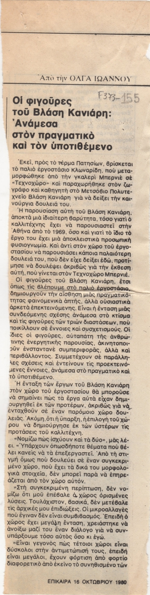 Απόκομμα, χαρτί, 2 φφ, 29×7,5 και 29×20 εκ., στα ελληνικά, δημοσίευσης κριτικής έκθεσης του Βλάση Κανιάρη, η οποία διεξάγεται στην Γκαλερί Bernier.