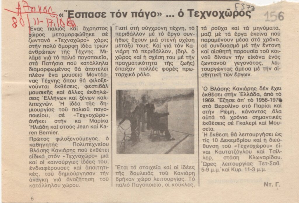 Απόκομμα, χαρτί, 9,5×14 εκ., στα ελληνικά, δημοσίευσης κριτικής έκθεσης του Βλάση Κανιάρη, η οποία διεξάγεται στον Τεχνοχώρο στην Αθήνα. Με την έκθεση εγκαινιάζεται ο χώρος.