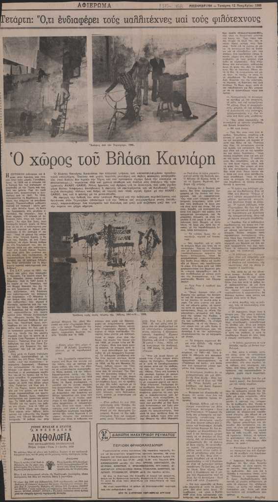 Απόκομμα, χαρτί, 58×32 εκ., στα ελληνικά, δημοσίευσης συνέντευξης του Βλάση Κανιάρη. Ο καλλιτέχνης μιλά για το έργο του, για τα υλικά που χρησιμοποιεί και για την πρωτοποριακή ματιά του. Το απόκομμα εικονογραφείται.