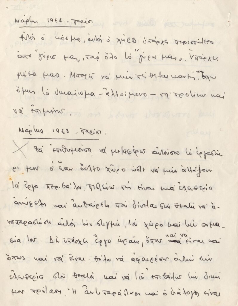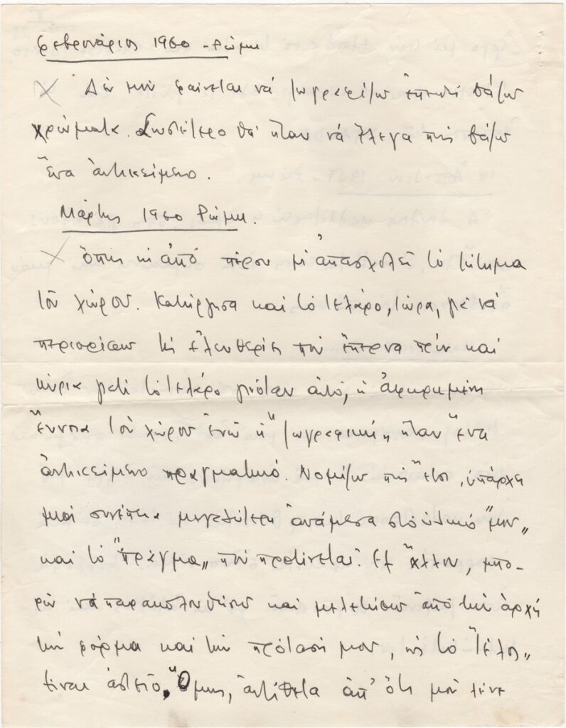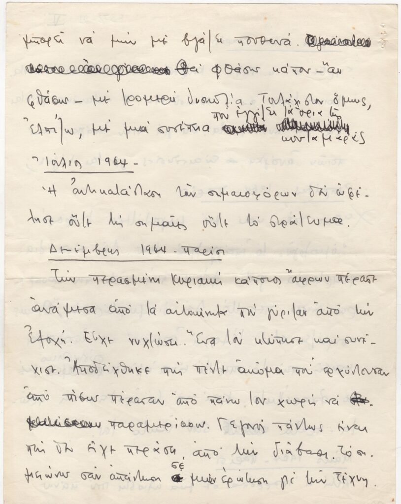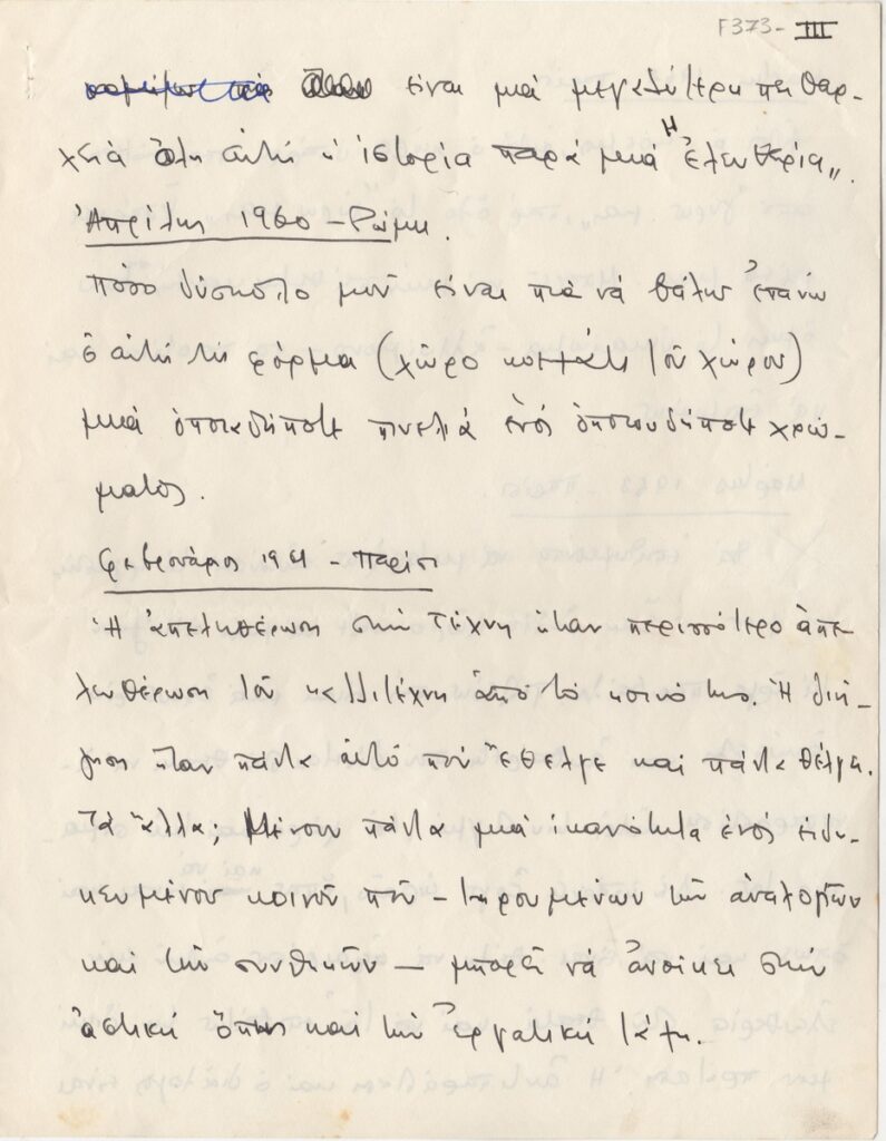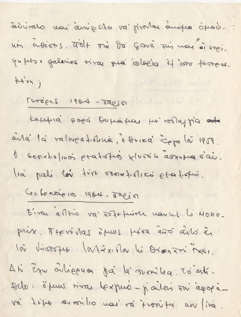 Κείμενο, χειρόγραφο, χαρτί, 4 φφ, 27×21 εκ., στα ελληνικά, του Βλάση Κανιάρη αναφορικά με το έργο του και την Τέχνη. Ο καλλιτέχνης μεταφέρει σκέψεις του σε ημερολογιακή μορφή για την περίοδο 1959-1964.