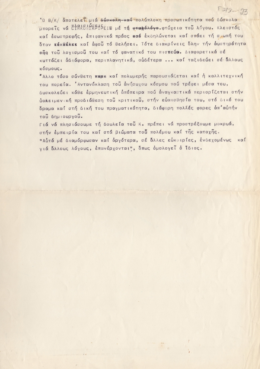 Κείμενο, δακτυλόγραφο, χαρτί, 29,5×21 εκ., στα ελληνικά, για το Βλάση Κανιάρη, το έργο του και την καλλιτεχνική του πορεία.