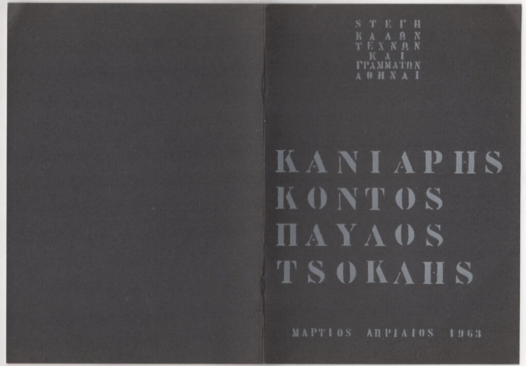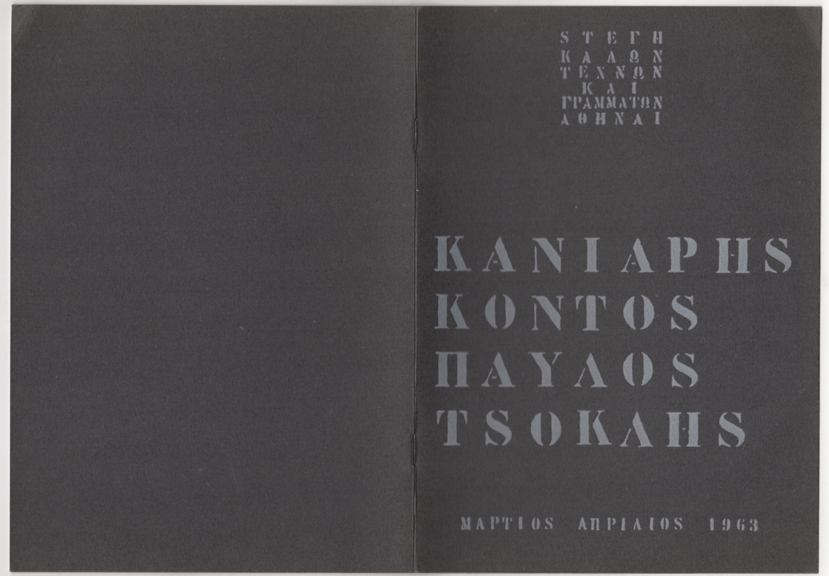Έντυπο, χαρτί, 6 φφ, 24,5×17 εκ., στα ελληνικά και γαλλικά, ομαδικής έκθεσης ζωγραφικής. Στην έκθεση συμμετέχουν με έργα τους οι Κανιάρης, Παύλος, Κοντός, Τσόκλης. Το έντυπο εικονογραφείται και περιέχει εισαγωγικό κείμενο του Γιώργου Κορνούτου, διοργανωτή της έκθεσης και κριτική του Τώνη Σπητέρη.
