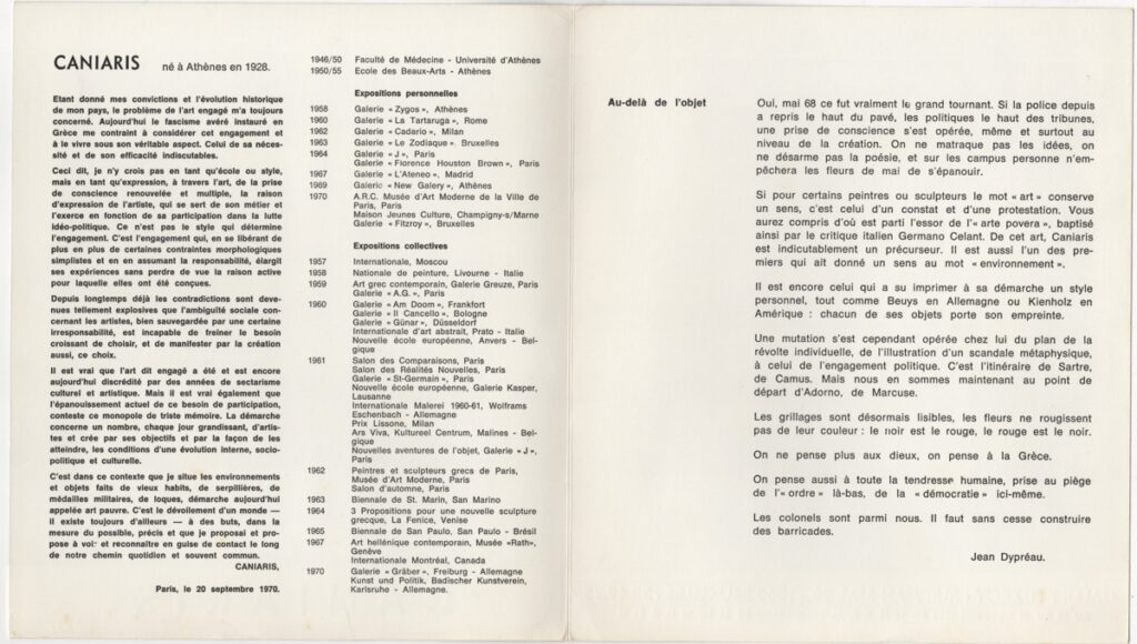 Έντυπο, χαρτόνι αναδιπλωμένο, 21,5×19 εκ., στα γαλλικά, ατομικής έκθεσης του Βλάση Κανιάρη. Περιέχει βιογραφικό του καλλιτέχνη, λίστα εκθέσεών του και κριτική με τίτλο “Au delà de l’ objet”. Το έντυπο εικονογραφείται.